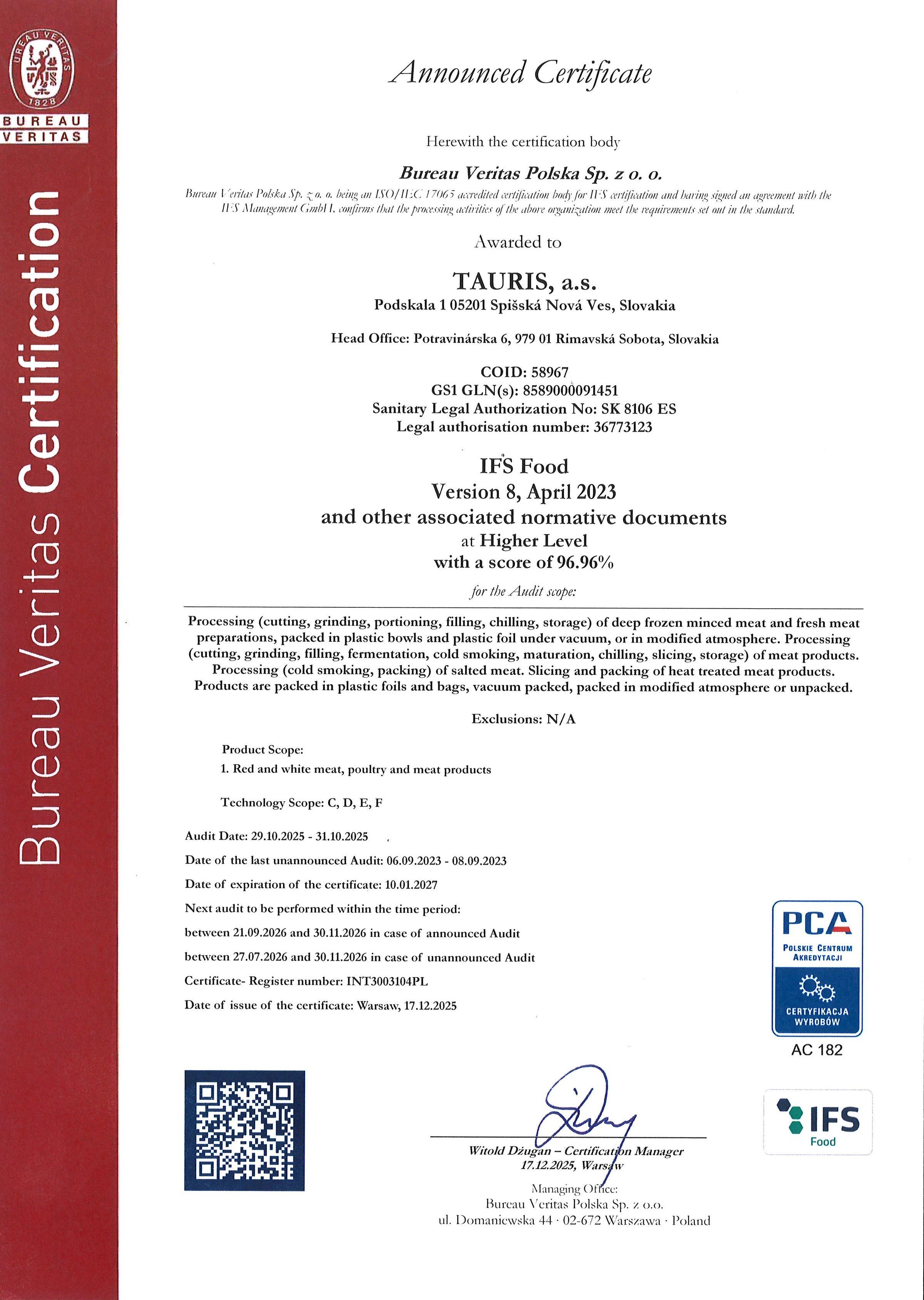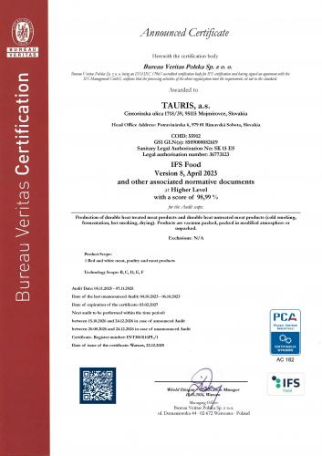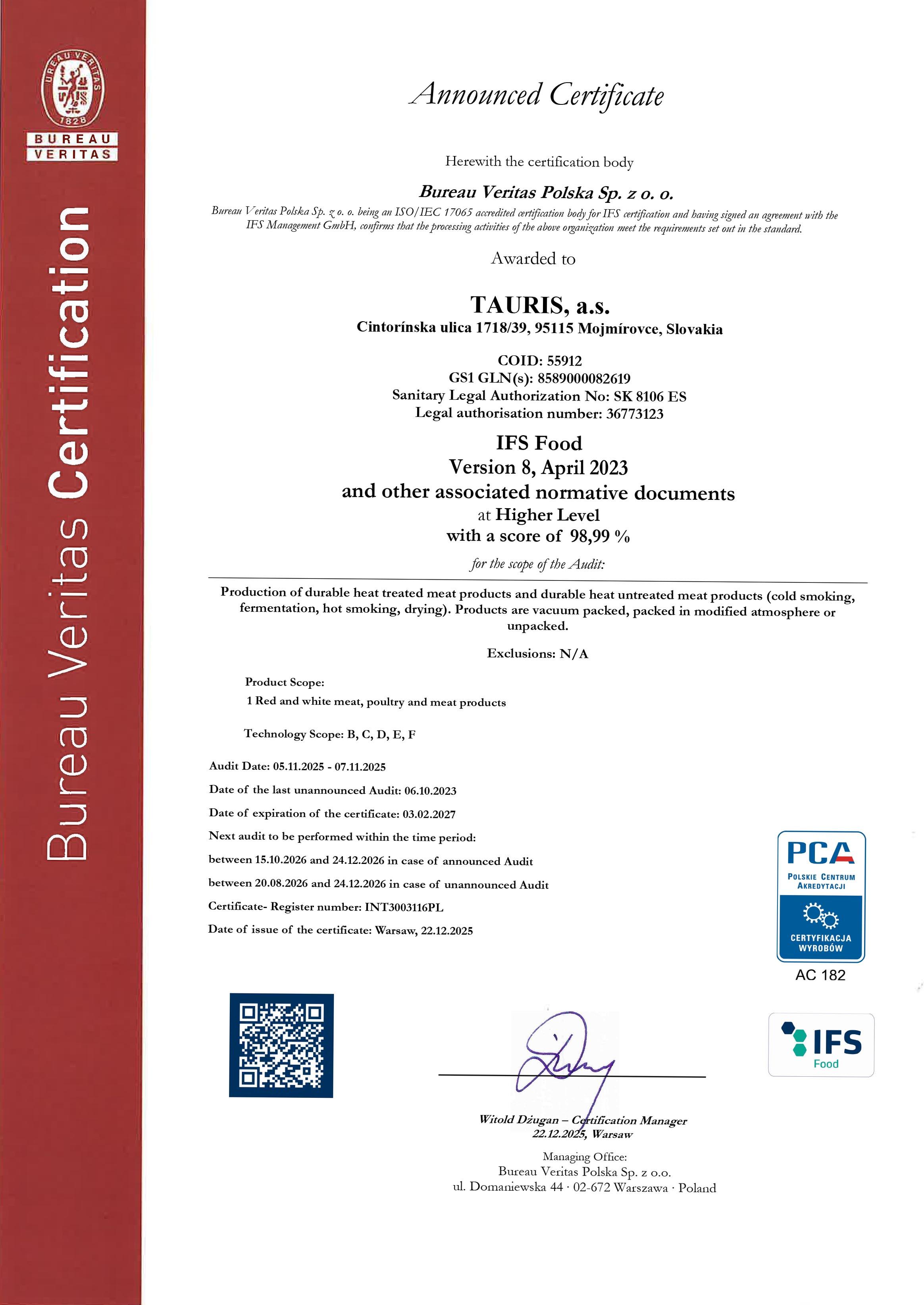Výroba mäsových výrobkov v slovenskej spoločnosti TAURIS podlieha prísnemu systému HACCP (Hazard Analysis and Critical Control Point) od roku 1997. Voľný preklad tohto termínu označuje systém, ktorý je založený na preventívnych opatreniach pri výrobe potravín.